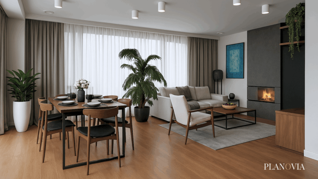 Część dzienna domu w Aurorach 7 zaprojektowana dla dewelopera. Największym wyzwaniem tego projektu było maksymalne wykorzystanie niewielkiej przestrzeni przeznaczonej na kuchnię. Najlepszym rozwiązaniem była zmiana konfiguracji okien tak, aby we wnęce umieścić górną zabudowę meblową. Loftowy charakter wnętrza został przełamany tkaninami okiennymi w salonie nadając mu nieco ciepła i przytulności.